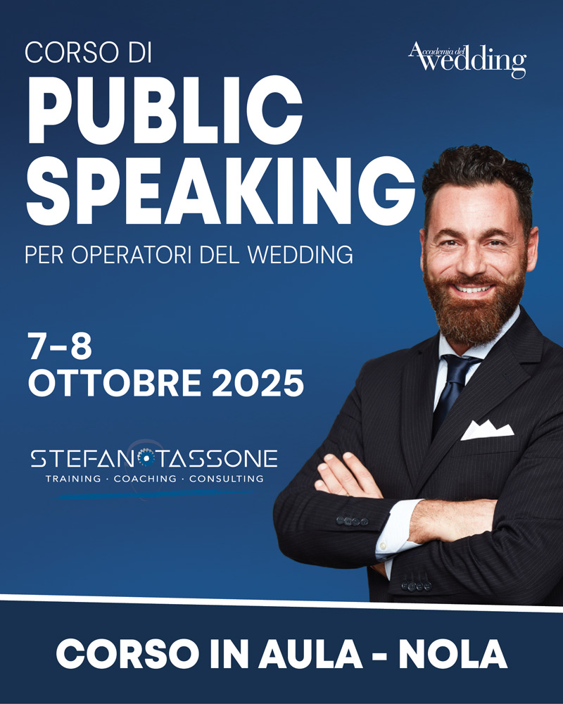 Il nuovo corso di Public Speaking tenuto da Stefano Tassone offrirà un’approfondita e specifica preparazione sui principali aspetti chiave legati al tema “comunicazione efficace”. Questo corso è rivolto a chi desidera completare al meglio la sua formazione per diventare un Wedding Planner & Event Coordinator in grado di veicolare con la massima efficacia tutta la sua professionalità e tutta la sua competenza.